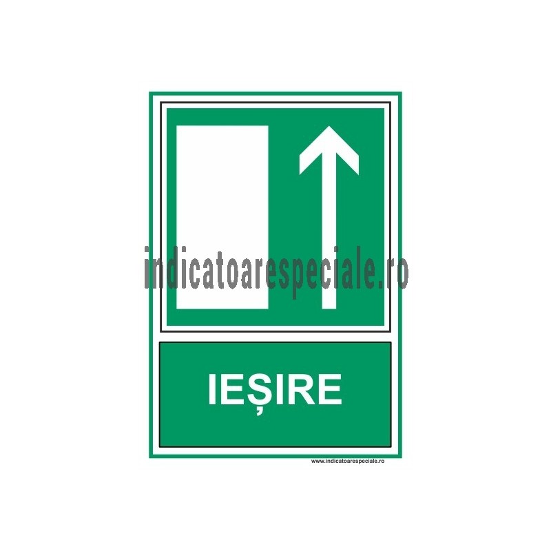 Indicator ce indica directia inainte, spre o cale de iesire din cladire, insotit de textul explicativ: IESIRE