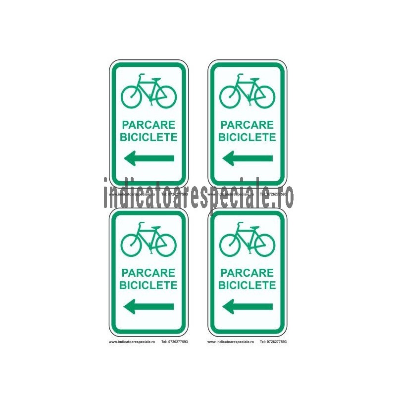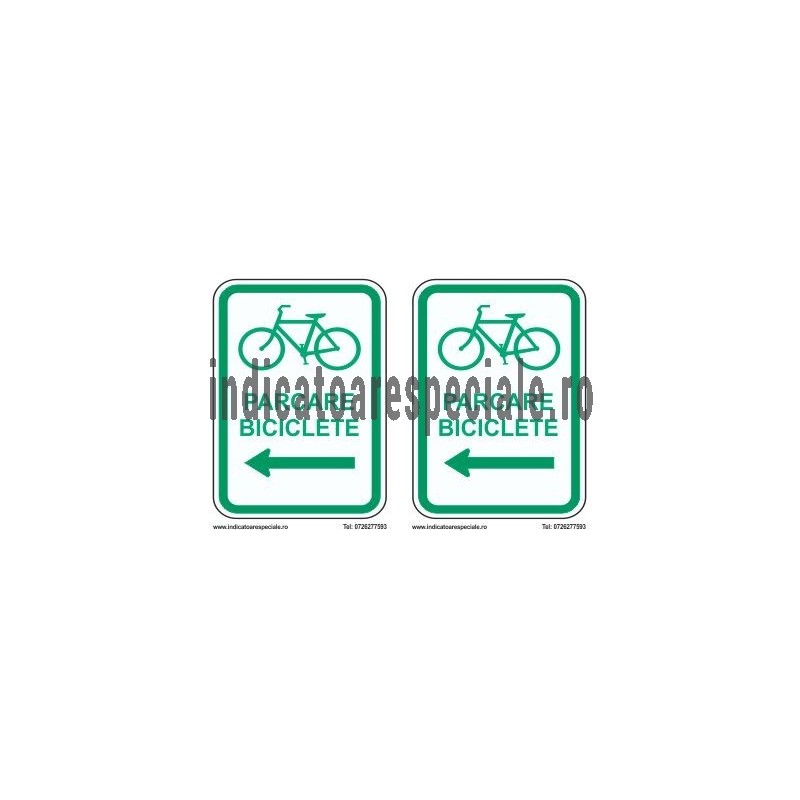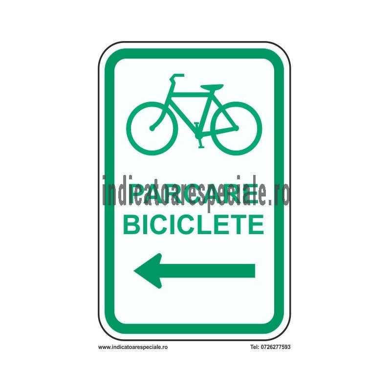 Indicator ce arata ca in acea zona exista un spatiu amenajat unde pot fi parcate bicicletele. Este un indicator de informare, cu o sageata ce indica directia spre stanga si cu textul explicativ: PARCARE BICICLETE.