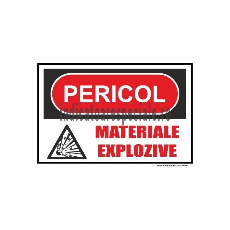 Pictograma sau simbol pentru interzicerea accesului si semnalizarea prezentei unor materiale explozive, periculoase in diverse situatii, insotit de textul explicativ: PERICOL - MATERIALE EXPLOZIVE